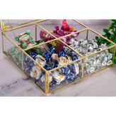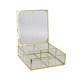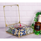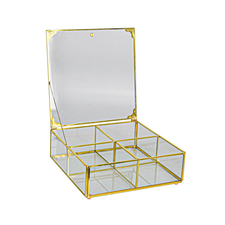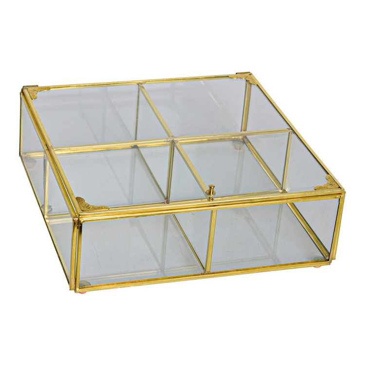 ظرف زیبای ارائه شده از جنس شیشه می باشد که با دقت و ظرافت لحیم کاری شده و دارای دری است که از بالا باز می شود و توسط زنجیر و آهنربای کوچکی که روی در و بدنه ظرف گذاشته شده نگهداشته می شود. خرج کار انجام شده روی آن, زیبایی ظرف را دوچندان نموده است. از این ظرف زیبا میتوان بعنوان ظرف تنقلات و آجیل و انواع دمنوش و همچنین لوازم تزئینی و ... استفاده کرد و چون دارای 4 قسمت مجزا می باشد بسیار کاربردی خواهد بود.