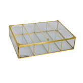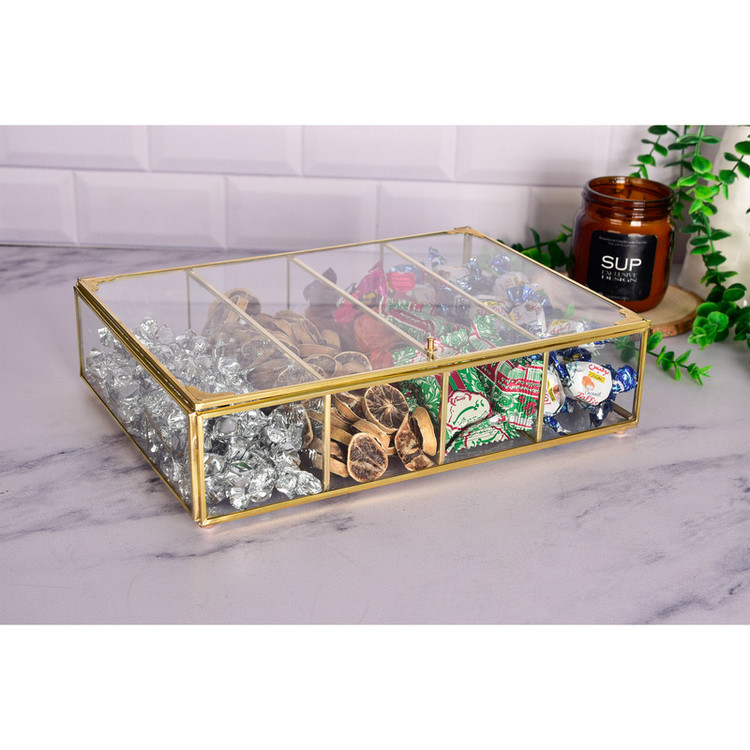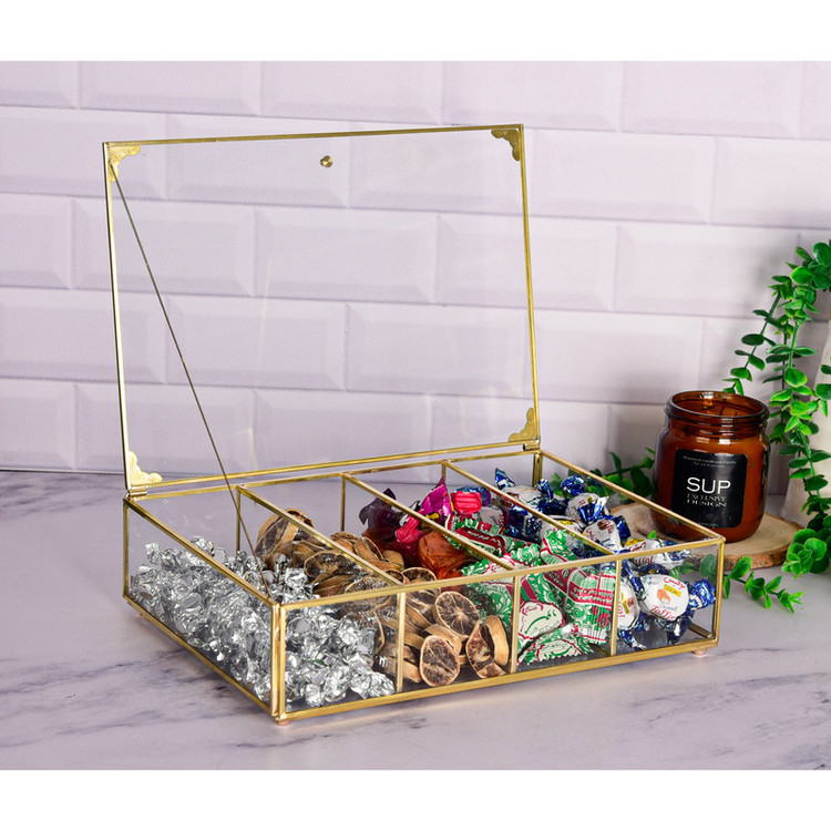 ظرف زیبای ارائه شده از جنس شیشه می باشد که با دقت و ظرافت لحیم کاری شده و دارای دری است که از بالا باز می شود و توسط زنجیر و آهنربای کوچکی که روی در و بدنه ظرف گذاشته شده نگهداشته می شود. خرج کار انجام شده روی آن, زیبایی ظرف را دوچندان نموده است. از این ظرف زیبا میتوان بعنوان ظرف تنقلات و آجیل و انواع دمنوش و همچنین لوازم تزئینی و ... استفاده کرد و چون دارای 4 قسمت مجزا می باشد بسیار کاربردی خواهد بود.