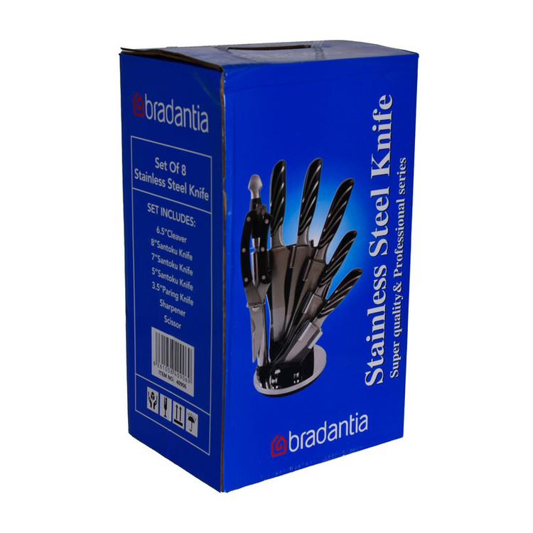 سرویس 8 پارچه بارادانتیا کد 40906 دارای تنوع مدل می باشد.که هر کدام کارایی خود را دارند. این سرویس علاوه بر تامین خواسته ّ بهخوبی در دست قرار میگیرد تا از اعمال فشار اضافی به دست در حین کار و صدمه رساندن به مچ دست جلوگیری میکند.این سرویس شامل یک عدد ساطور چهار عدد چاقو یک عدد چاقو تیز کن یک عدد قیچی و یک عدد استند میباشد