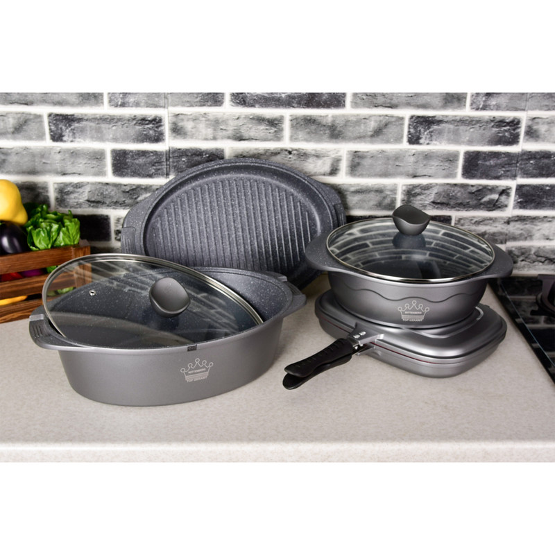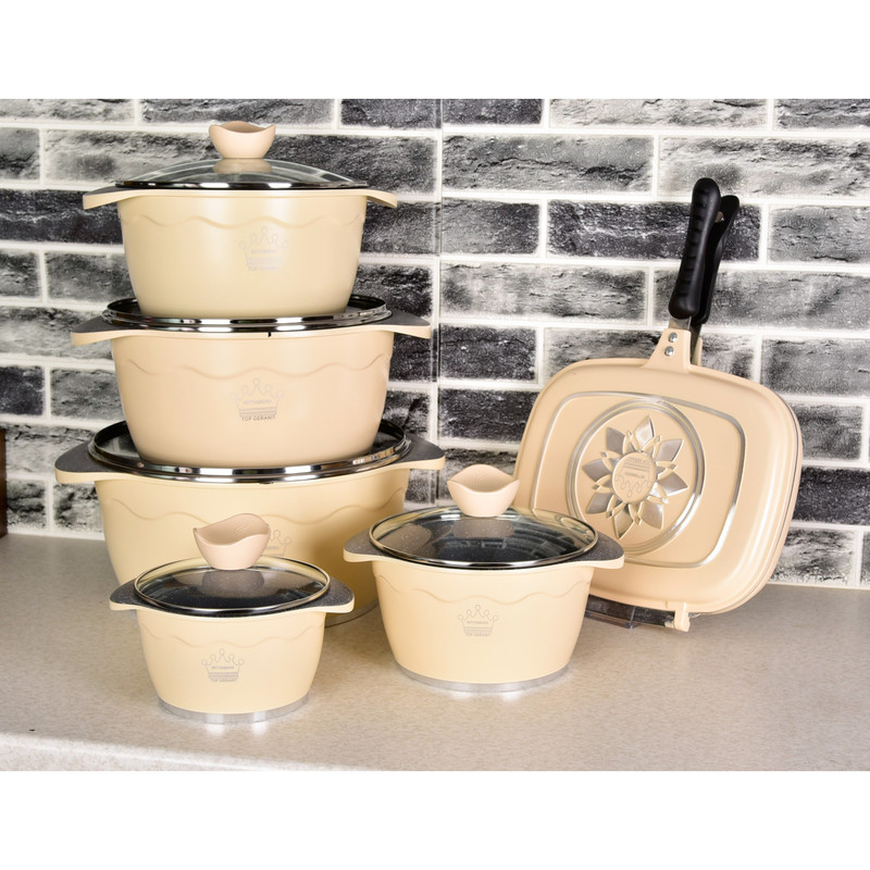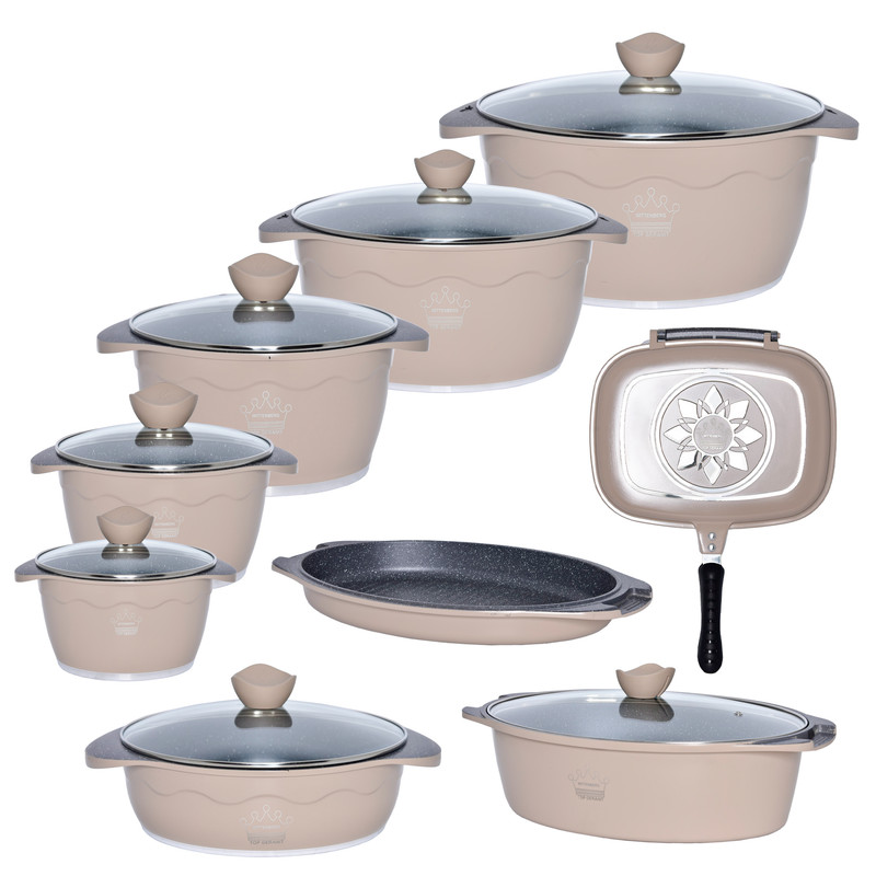 این سرویس شامل پنج قابلمه در سایزهای 32 و 16و 28 و 24 و 20 و یک تابه دو دسته سایز 28 .تابه رژیمی 32 و تابه مرغ و ماهی 42 می باشد.